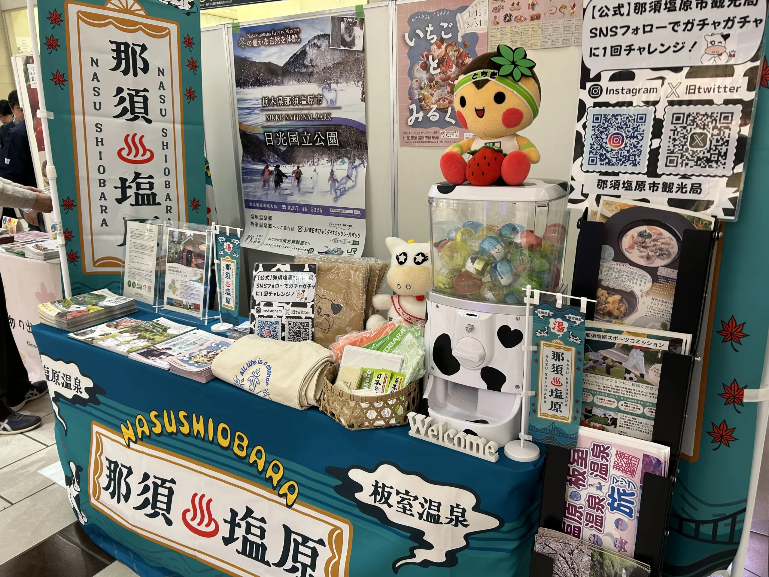 栃木県アンテナショップ「とちまるショップ」に続いて、埼玉県越谷市の大型商業施設イオンレイクタウンにおいて観光キャラバンに参加しました。本キャラバンは、首都圏有数の集客拠点において那須塩原市の観光資源を直接発信し、来訪意欲の喚起および認知拡大を図ることを目的に開催したものです。