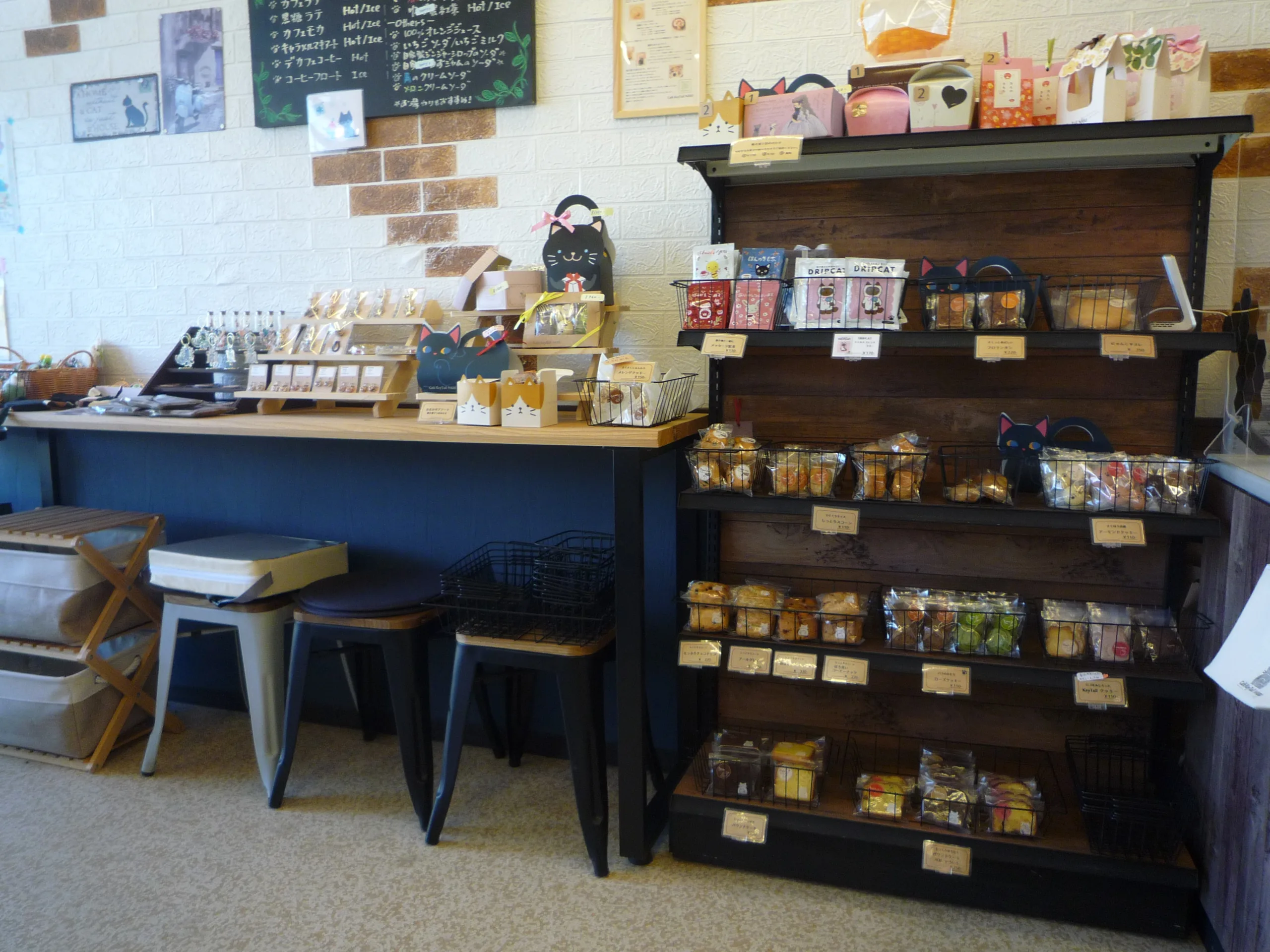 猫をモチーフにしたお菓子などを販売しています。いつでも気軽にスイーツをお買い求めいただけるよう、店舗前の自動販売機コーナーに「スイーツ」の自動販売機も設置しています。