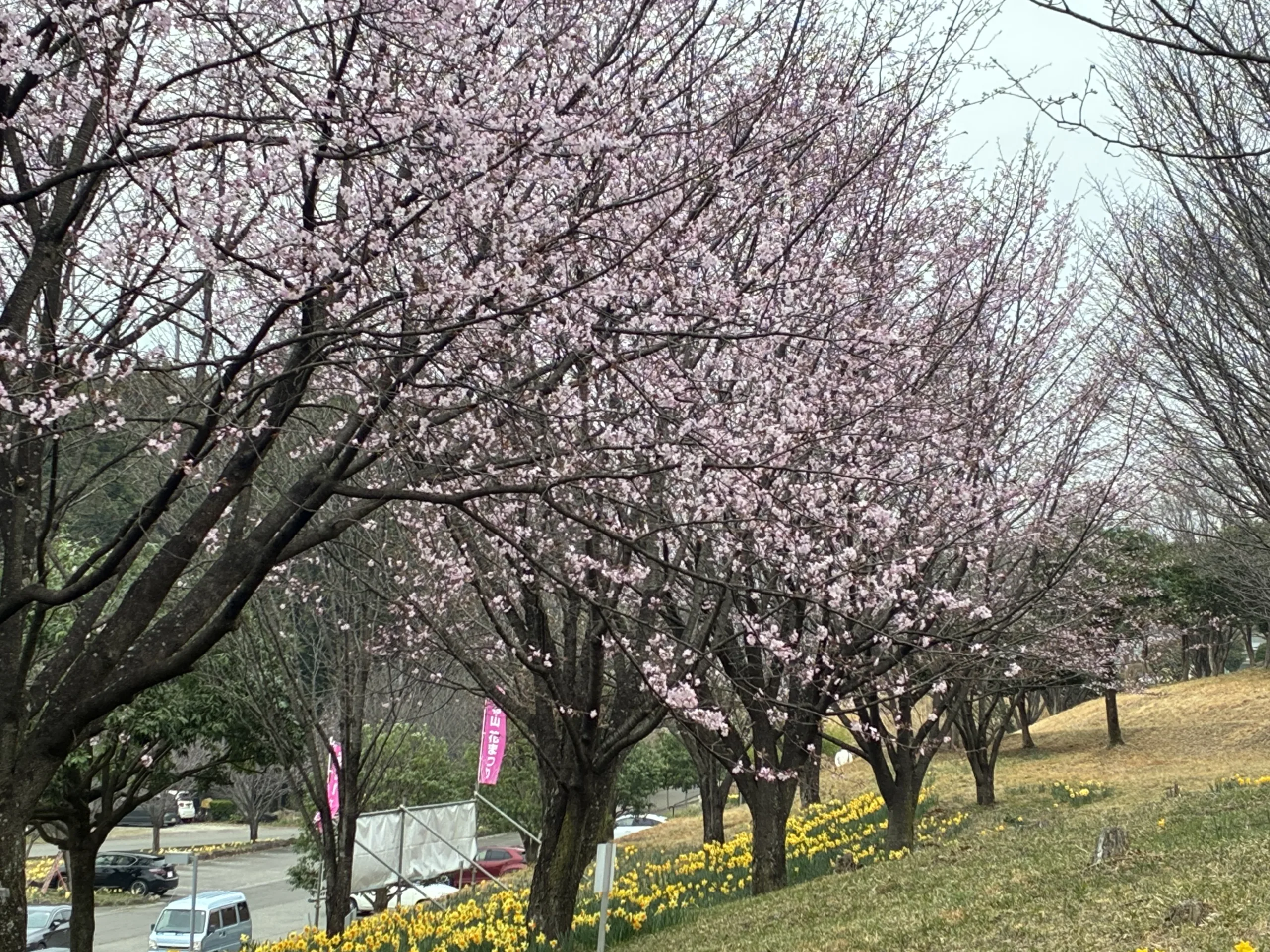 スイセンの黄色と桜の淡いピンクが織りなす、今しか見られない春の共演が楽しめます。