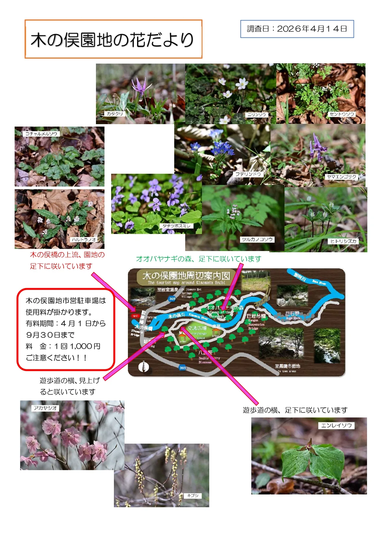 散策路をゆっくり歩きながら、季節の移ろいを感じてみませんか。これから見頃を迎える花々とともに、木の俣園地ならではの穏やかな春の風景をお楽しみいただけます。
