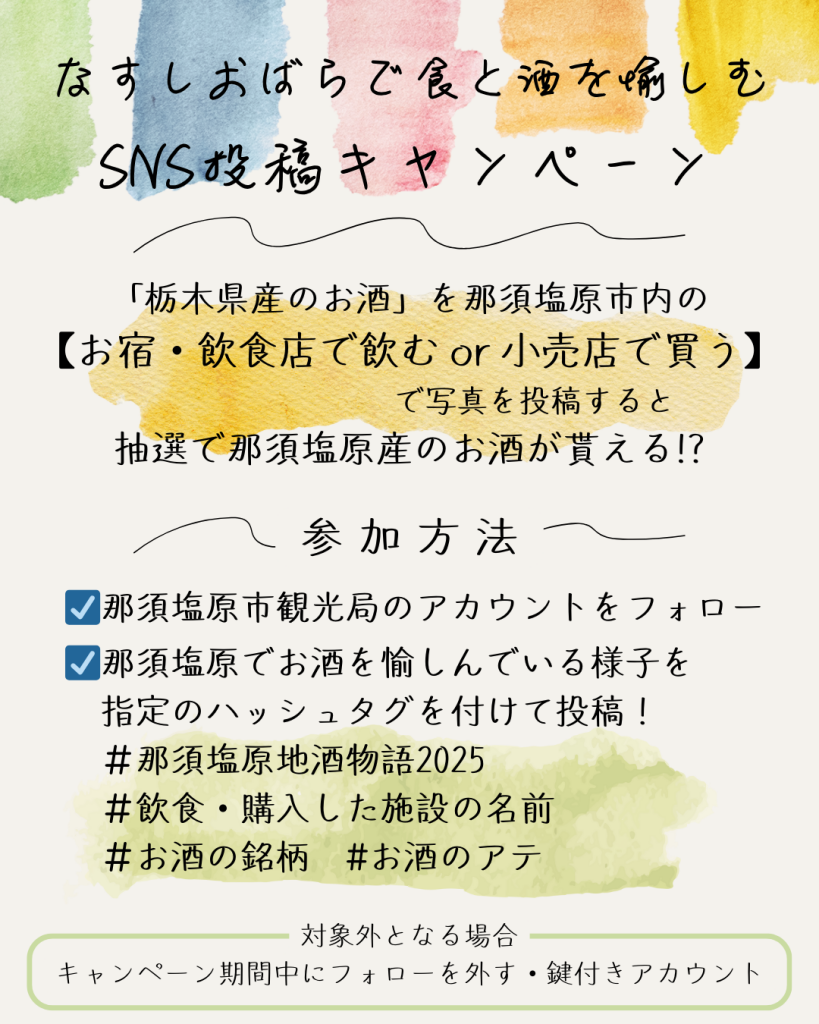 【参加方法】☑那須塩原市観光局のアカウントをフォロー ⇒@nasushiobara_city_tourism☑栃木県産のお酒を那須塩原市内の ”お宿・飲食店で飲む”or”小売店で買う”☑お酒と食を愉しんでいる様子を指定のハッシュタグを付けて投稿! #那須塩原地酒物語2025 #お酒を飲んだ・購入した施設の名前 #お酒の銘柄 #お酒のアテ
