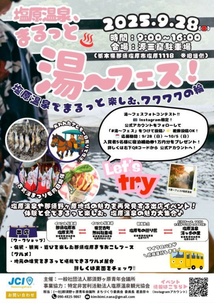 塩原漁業組合による鮎とカジカの塩焼きや、塩原のご当地グルメとて焼の販売のほか、キッチンカーやワークショップ等体験型のブースが源三窟駐車場に並びます。