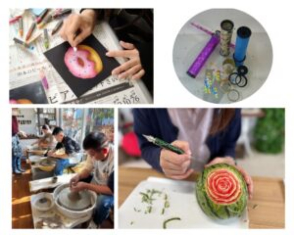 陶芸やガラス工芸などの伝統的な物から、ナイフ一本で絵を描くように彫り上げるカービングや、さらにはアロマの香りを使った香水づくりなど、大人も子供も楽しめるもの作り体験が盛り沢山。