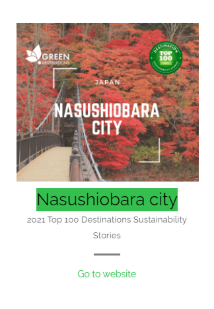那須塩原市は、国際的な認証団体であるグリーン・ディスティネーションズ(オランダ)が実施する表彰制度にエントリーし、「世界の持続可能な観光地TOP100選」に選出されました。これは、より良い観光地づくりに努力している地域を毎年選出しているものです。2021年度に選出されたのは9地域で、関東地区からは唯一、那須塩原市が選ばれました。