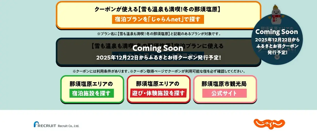 ・プラン名に【雪も温泉も満喫!冬の那須塩原】と記載のあるプランが対象です。クーポン取得ページでクーポンが利用可能な宿を 必ず確認してください。