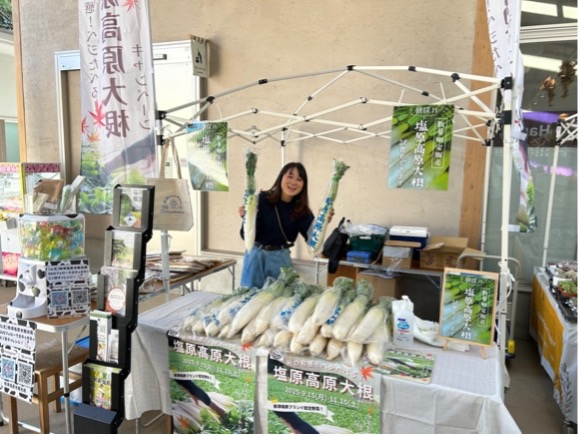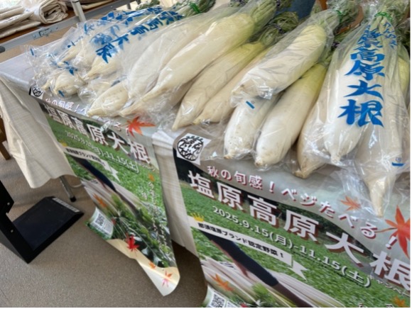那須千本松牧場で開催されている千本松マルシェに10月12日(日)那須塩原市観光局として出展しました。まだ紅葉には早い日ではありましたが、気候にも恵まれた観光日和のこの日は、多くの観光客が来場されていました。観光局ブースでは、旬の塩原高原大根を中心に、観光局商品や市内お土産品の販売を行い、非常に好評でした。たくさんご用意した大根もすぐに売り切れ、那須塩原の秋の味覚をPRできる良い機会となりました。
